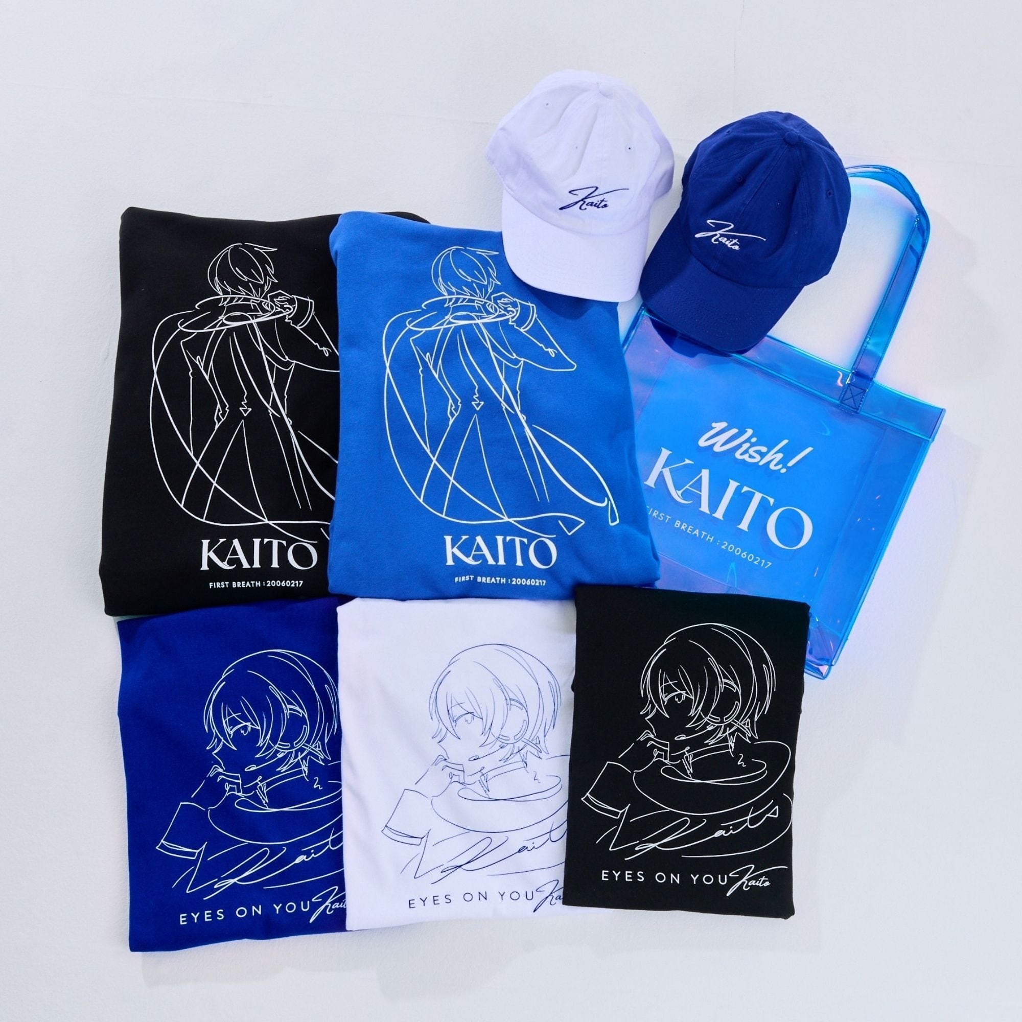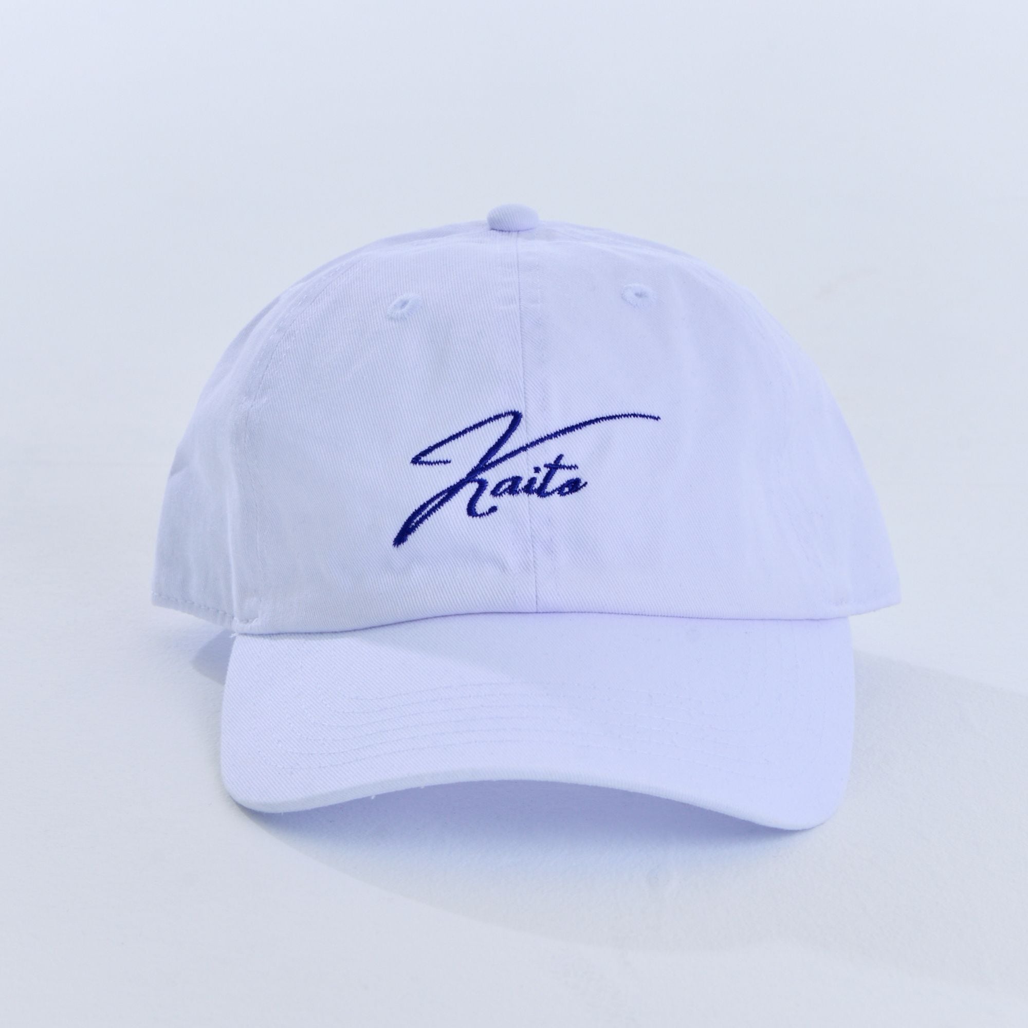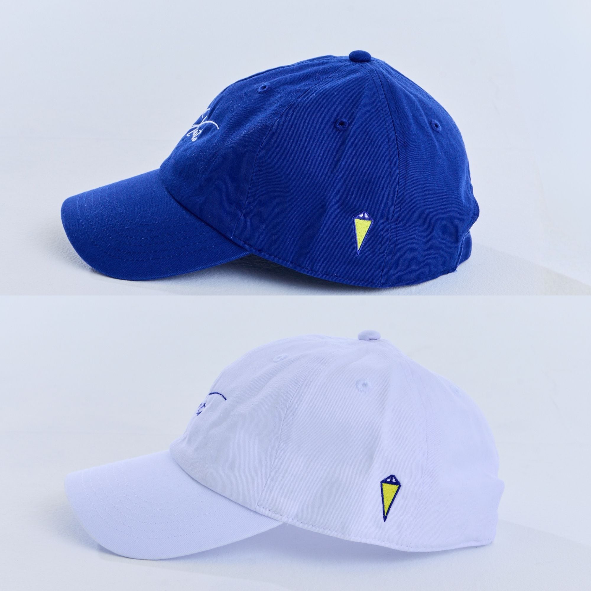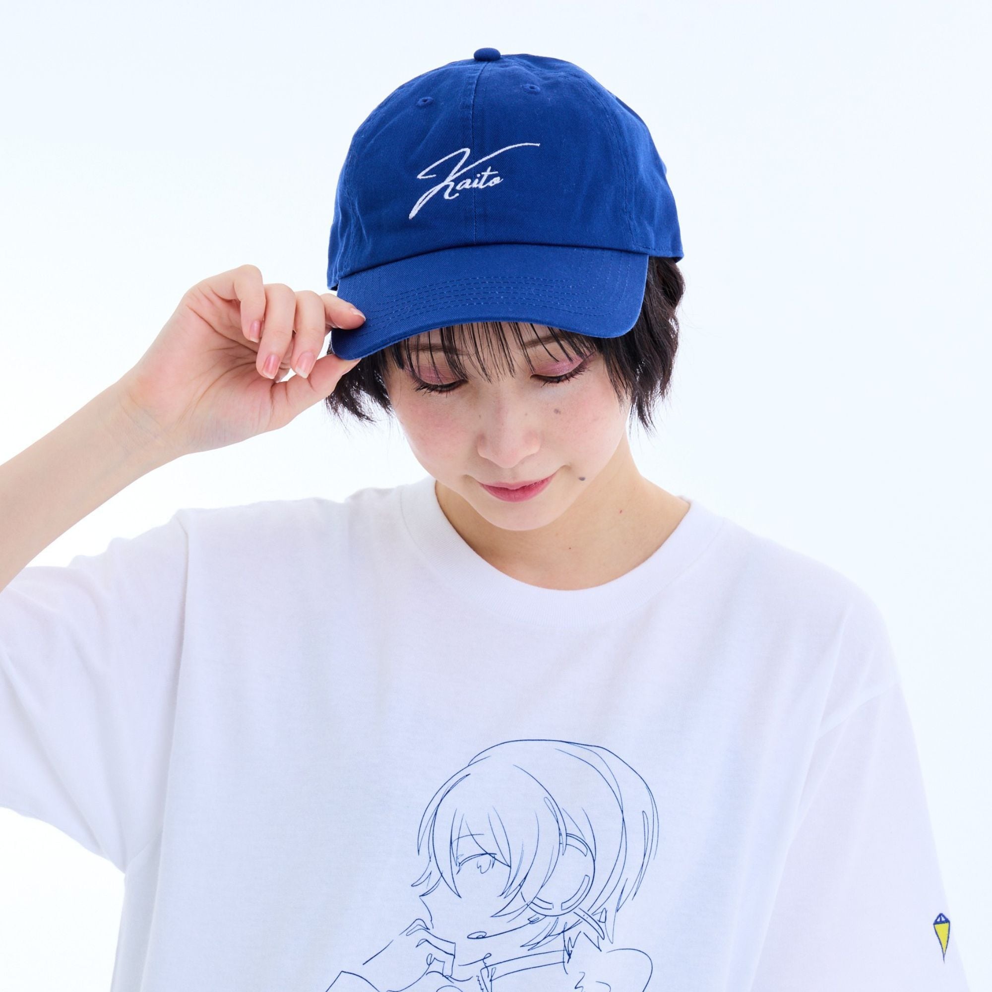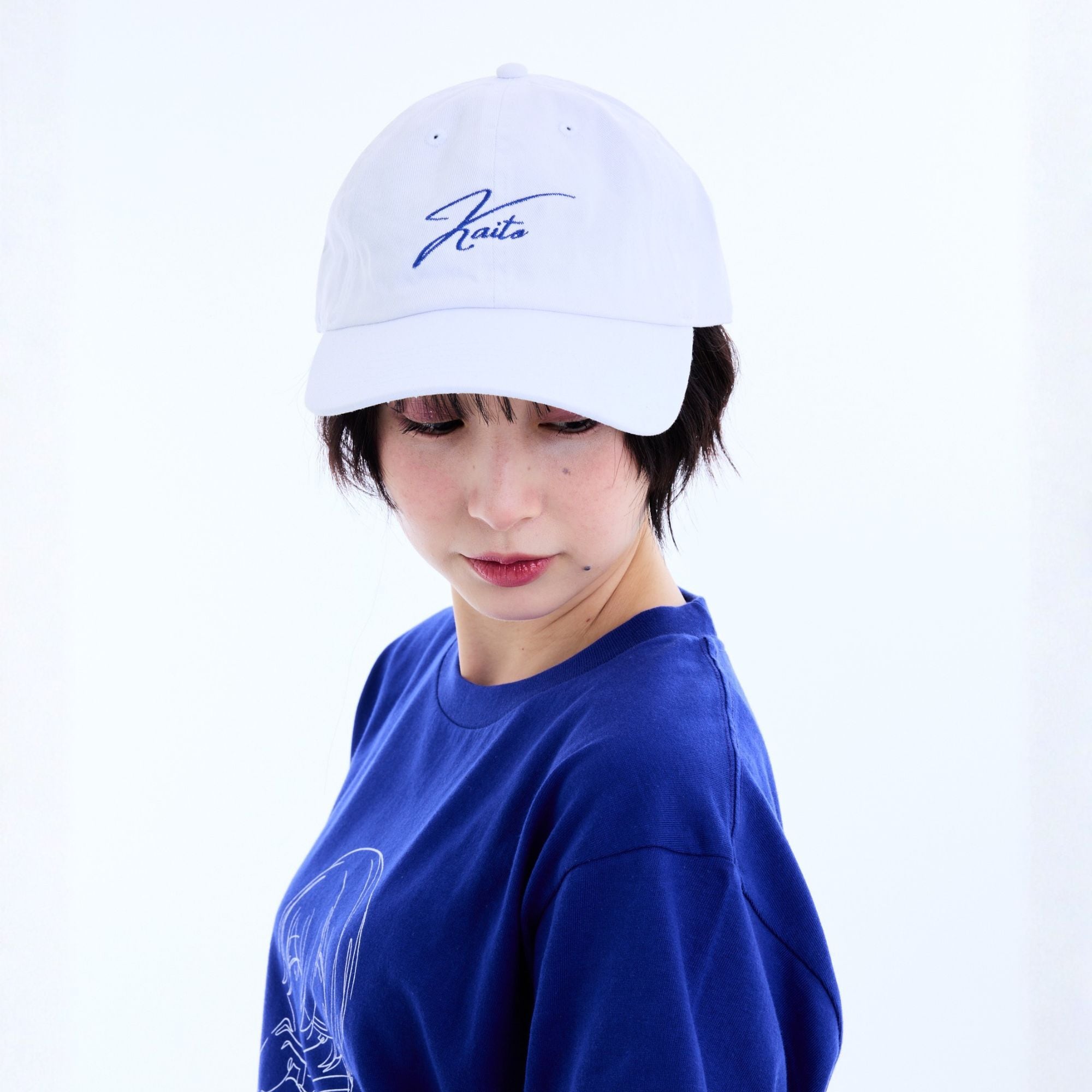 フロントに「KAITO」の刺繍、左こめかみにはKAITOのモチーフを刺繍で再現しました。カラーはブルーとホワイトの2色です。